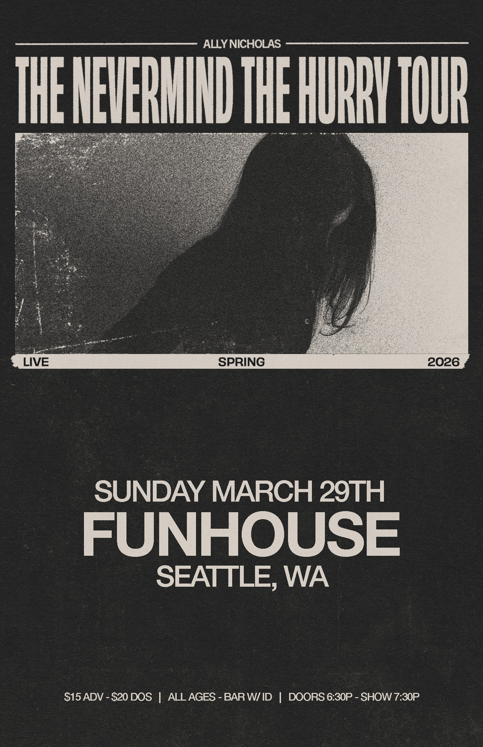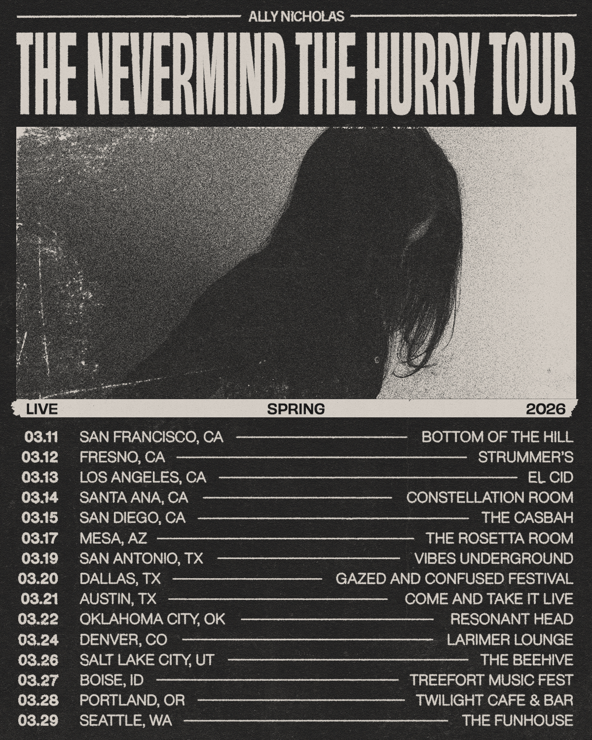 After dropping out of college her freshman year, Ally couch-surfed around New York until she found a home at a Manhattan-based studio, Engine Room Audio. From there she worked toward her goal of becoming a recording artist. With only five singles out, Ally has amassed 6.5 million streams across platforms and received recognition by publications like Ones To Watch and Euphoria Mag. She and her band have played to sold out crowds at venues such as The Viper Room and the El Cid in Los Angeles, and The Well in Brooklyn. Following the release of her second single, Ones to Watch concluded, “...Ally Nicholas has solidified herself as a rising artist who is fully deserving of our captivation; we might even venture to say that this hypnotic artist has cast a spell on us”.