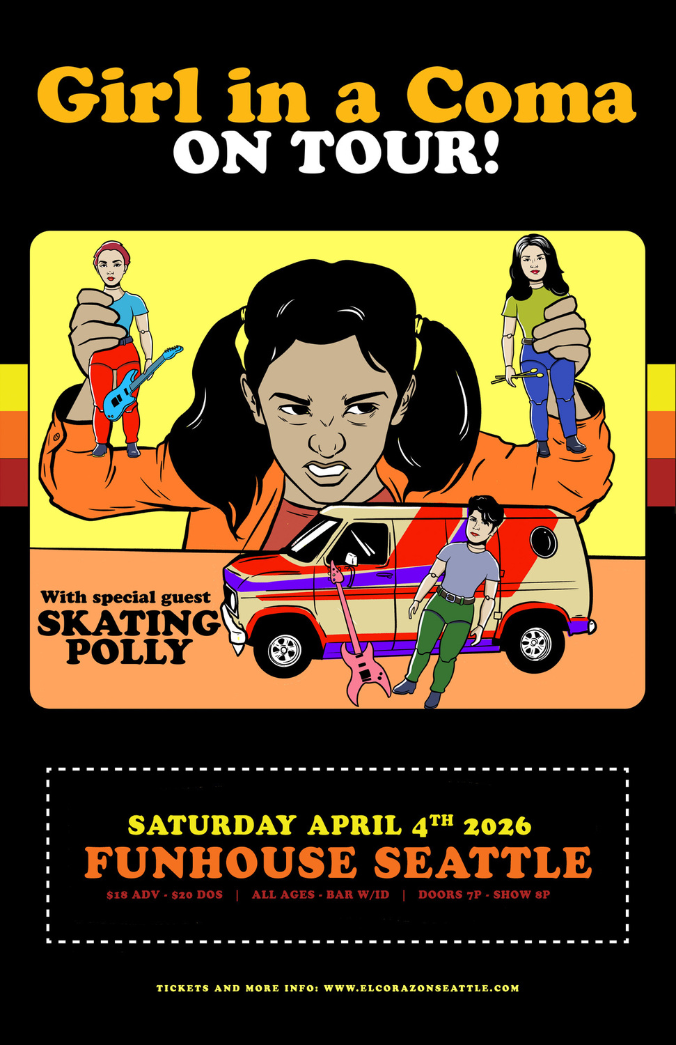 Naming themselves in homage of ' song "Girlfriend in a Coma," Girl in a Coma started in San Antonio, TX, with bassist Jenn Alva and drummer Phanie Diaz, two best friends who bonded thanks to a shared interest in and . The duo endured several failed experiments in both band lineups and musical styles before discovering that , Phanie's younger sister, possessed talent as a singer, guitarist, and songwriter. Though was only 12 when she performed her first song for them, both Alva and Diaz recognized her potential. After recruiting the younger Diaz, Girl in a Coma spent five years writing, performing, and touring before coming to the attention of label reps and tour managers in the summer of 2004. One of the managers sent a homemade demo tape to music director ; after hearing it, invited the trio to London to record its first demo. Soon after returning, Girl in a Coma found themselves featured in a television documentary about emerging Latino bands. As part of the show, the group went to New York City for a show at the Knitting Factory and a surprise meeting with Joan Jett. While on camera, Jett and her producing partner Kenny Laguna praised the trio's set -- and invited the band to join the Blackheart Records label. Girl in a Coma accepted and released their debut album, Both Before I'm Gone, in May 2007.