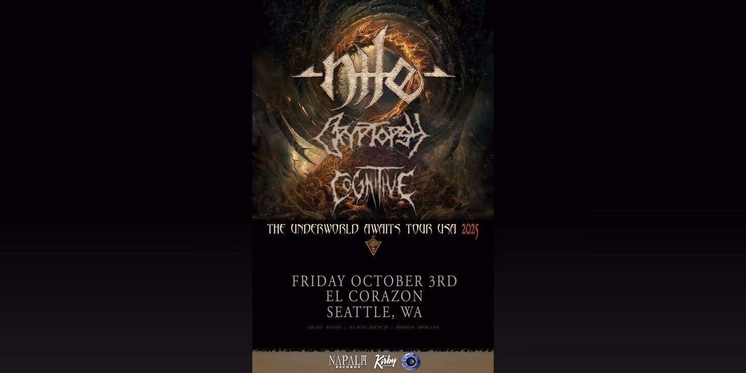 The Underworld Awaits Tour USA 2025: Nile, Cryptopsy, The Last Ten Seconds Of Life, plus Cognitive, at El Corazón