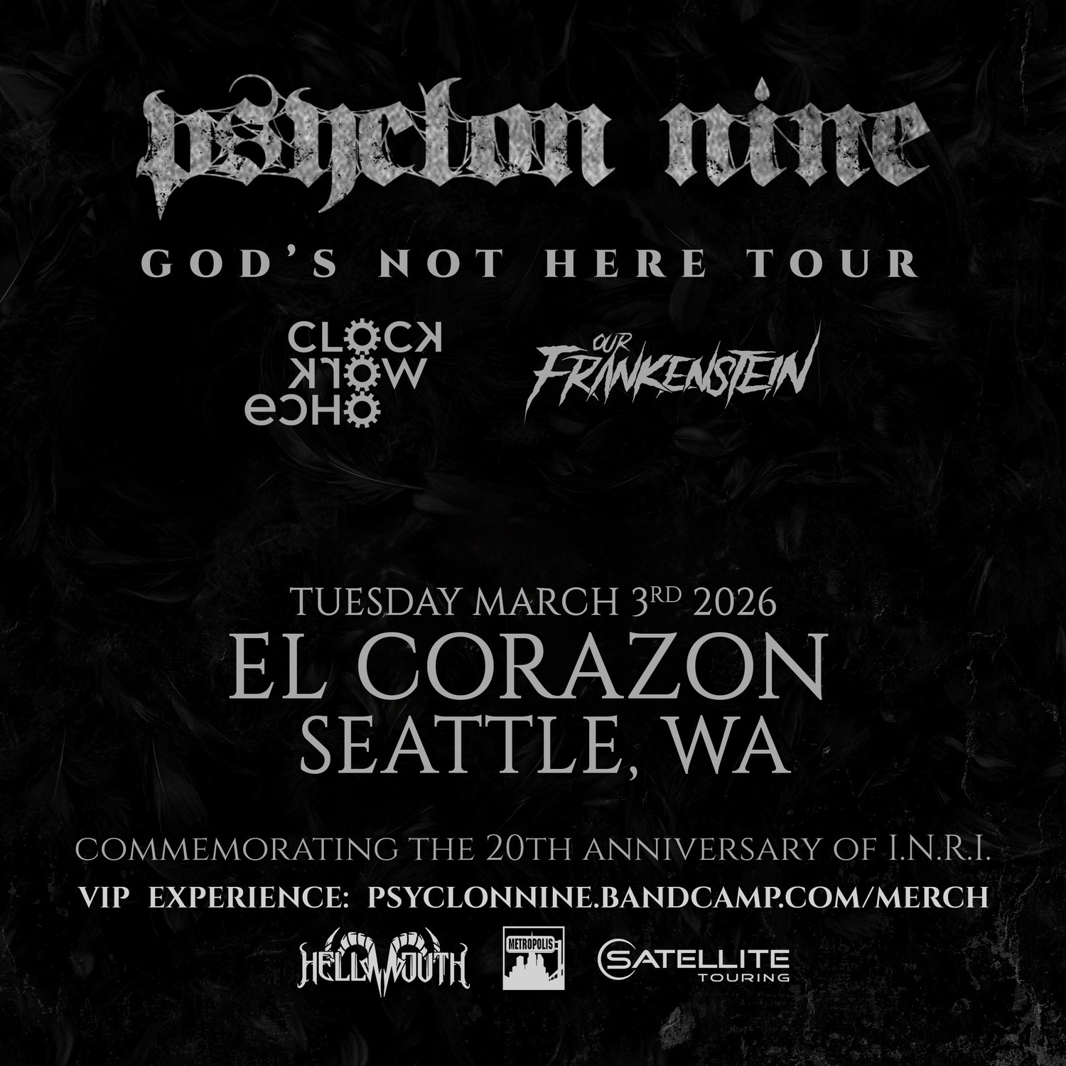 Since forming in the year 2000 by frontman ( / ) Psyclon Nine has cemented it’s name into the history books as one of the most infamous and successful bands of the Industrial and Metal crossover genres. Each of Psyclon Nine’s 6 full-length releases have charted internationally appearing in the Top 10 of the DAC and landing a position on the Top 200 Billboard Rock Charts in the USA. Psyclon Nine garnered a large, die-hard fan base while touring with Metropolis Records label mates as well as other international acts such as , and appearing as a headlining act three times at the Wave Gotik Treffen festival in Leipzig Germany to an audience of over 30,000 fans. After their recent, successful Tour Of The Worm Infektion in the USA in support of their newest release Icon Of The Adversary, Psyclon Nine toured once more in celebration of the 10 year anniversary of their 4th full length album We The Fallen and subsequent “Ruinatour”. The RuinaTWOr included band members Tim Skold (, , ) on guitar, Rotny Ford on synthesizer and bass as well as Jon Siren (, ) on drums. We The Fallen has been described as the pivotal, breakout album for Psyclon Nine. It was the bands first album to appear on the Billboard Rock Charts, became the Number 2 album through Hottopic and would catapult the band from a genre-specific scene into the greater alternative world.